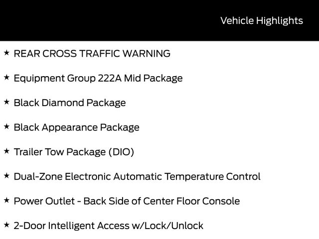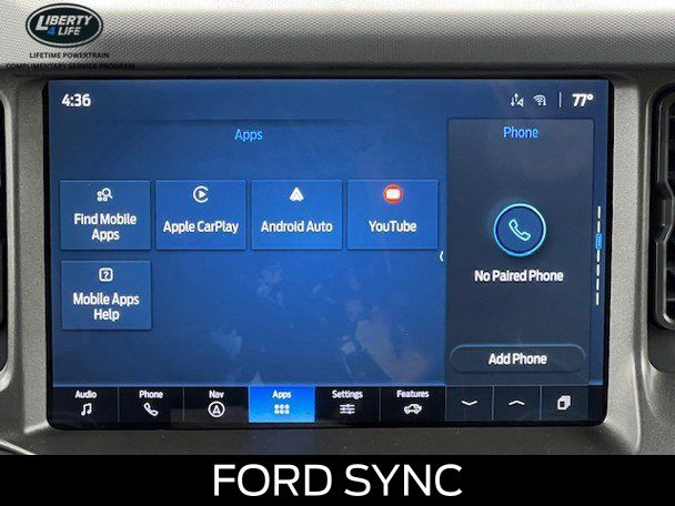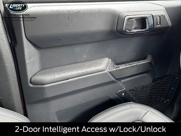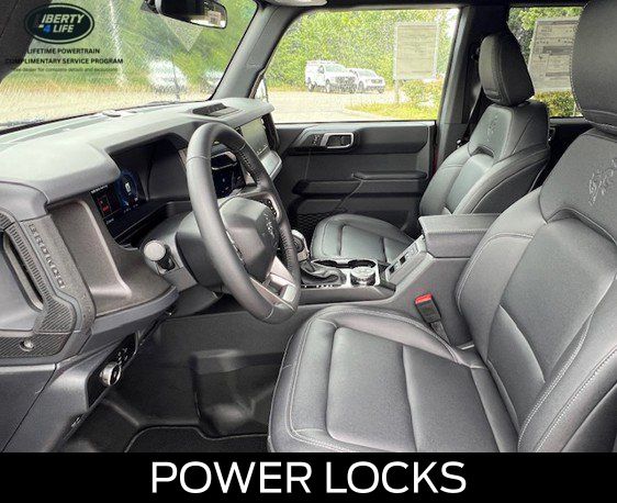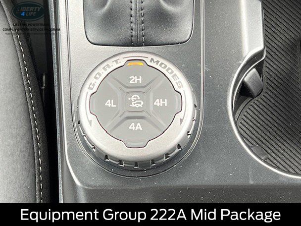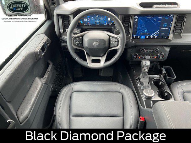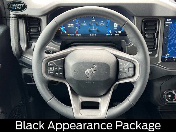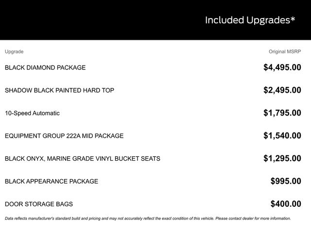 BLUETOOTH, HEATED SEATS, REMOTE START, CRUISE CONTROL, POWER WINDOWS, POWER LOCKS, MULTI-ZONE CLIMATE CONTROL, STEERING WHEEL CONTROLS, AWD / 4WD, LANE DEPARTURE WARNING, LANE KEEP ASSIST, APPLE CARPLAY, ANDROID AUTO, FORD SYNC, AUTOMATIC EMERGENCY BRAKING, FORWARD COLLISION WARNING, REAR CROSS TRAFFIC WARNING, 2-Door Intelligent Access w/Lock/Unlock, 4.46 Final Drive Ratio w/Rear Locking Differential, Ambient Footwell Lighting, Auxiliary Switches, Black Appearance Package, Black Diamond Package, Black Molded-In-Color Door Handles, Black Molded-In-Color Fender Flares, Black Molded-In-Color Sideview Mirror Caps, Black-Painted Molded-In-Color Grille, Connected Navigation, Dr & Pass Illuminated Sliding Visor Vanity Mirrors, Dual Smart Charging USB Ports, Dual-Zone Electronic Automatic Temperature Control, Equipment Group 222A Mid Package, Front Row Heated Seats, Hard Top Sound Deadening Headliner, Heated door mirrors, LED Fog Lamps, Powder Coated Steel Front & Rear Bumpers, Power door mirrors, Power Outlet - Back Side of Center Floor Console, Rear Parking Sensors, Rear-Window Defroster & Washer, Rock Rails, Shadow Black Painted Hard Top, Trailer Tow Package (DIO), Washout Capable Rubberized Flooring, Wheels: 17" Black High Gloss Painted Aluminum.