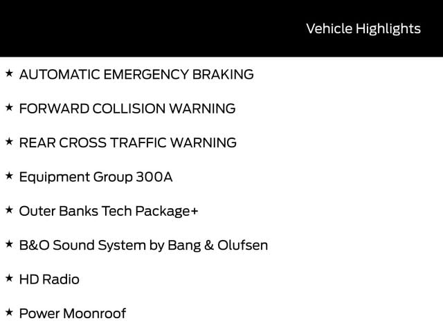 LEATHER SEATS, BACK UP CAMERA, BLUETOOTH, HEATED SEATS, REMOTE START, CRUISE CONTROL, POWER WINDOWS, POWER LOCKS, MULTI-ZONE CLIMATE CONTROL, STEERING WHEEL CONTROLS, AWD / 4WD, LANE DEPARTURE WARNING, LANE KEEP ASSIST, APPLE CARPLAY, ANDROID AUTO, FORD SYNC, AUTOMATIC EMERGENCY BRAKING, FORWARD COLLISION WARNING, REAR CROSS TRAFFIC WARNING, B&O Sound System by Bang & Olufsen, Connected Navigation, Equipment Group 300A, HD Radio, Outer Banks Tech Package+, Power Moonroof. 25/30 City/Highway MPG