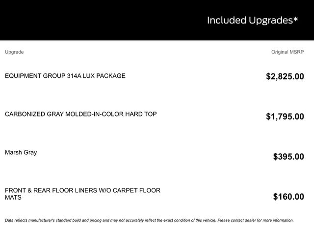 Although every reasonable effort has been made to ensure the accuracy of the information contained on this site, absolute accuracy cannot be guaranteed. This site, and all information and materials appearing on it, are presented to the user "as is" without warranty of any kind, either express or implied. All vehicles are subject to prior sale. Price does not include applicable tax, title, license, and/or $398 documentary service fee.â¡ All titling is subject to a minimum $18 processing fee (varies by County). Vehicles shown at different locations are not currently in our inventory (Not in Stock) but can be made available to you at our location within a reasonable date from the time of your request, not to exceed one week. See dealer for complete details and exclusions on the Liberty 4 Life Program. *Disclaimer: The information provided regarding vehicle options and original MSRP is sourced from third-party data providers. While every effort has been made to ensure the accuracy of the information provided here, the dealer shall not be held liable for any inaccuracies in the options or original vehicle and option pricing. It is strongly advised to consult with the dealer for verification and comprehensive details prior to making a purchase.