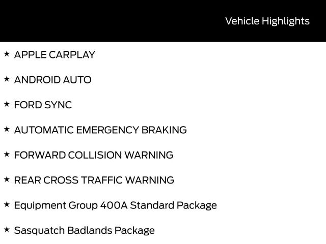 The Badlands Tech Package, Equipment Group 400A Standard Package, Ford Connectivity Package, and Sasquatch Badlands Package further enhance the capabilities of this Bronco Sport. Standout features include the premium B&O sound system, connected navigation, leather-trimmed heated front seats, and the HOSS 3.0 Off-Road Suspension for unparalleled capability.