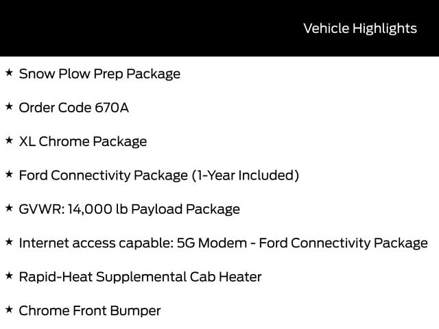 BLUETOOTH, TOW PACKAGE / TRAILER HITCH, REMOTE START, CRUISE CONTROL, POWER WINDOWS, POWER LOCKS, STEERING WHEEL CONTROLS, AWD / 4WD, LANE DEPARTURE WARNING, LANE KEEP ASSIST, APPLE CARPLAY, ANDROID AUTO, FORD SYNC, AUTOMATIC EMERGENCY BRAKING, FORWARD COLLISION WARNING, REAR CROSS TRAFFIC WARNING, 4WD, 410 Amp Dual Alternators, Chrome Front Bumper, Chrome Rear Step Bumper, Ford Connectivity Package (1-Year Included), GVWR: 14,000 lb Payload Package, Halogen Fog Lamps, Internet access capable: 5G Modem - Ford Connectivity Package, Order Code 670A, Rapid-Heat Supplemental Cab Heater, Snow Plow Prep Package, XL Chrome Package.