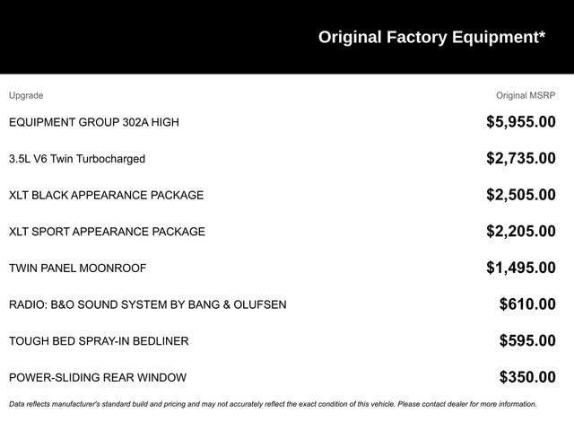 The XLT 302A High Equipment Group takes this truck to the next level, offering a host of premium features. Enjoy the convenience of the Intelligent Access with Push-Button Start, the versatility of the Onboard 400W Outlet, and the seamless connectivity of the SYNC 4 system with Enhanced Voice Recognition. The XLT Black Appearance Package and XLT Sport Appearance Package add a touch of style and personality, with features like the Black 6" Angular Step Bars, Body-Color Door & Tailgate Handles, and Unique Hood & Grille with Black Accent.